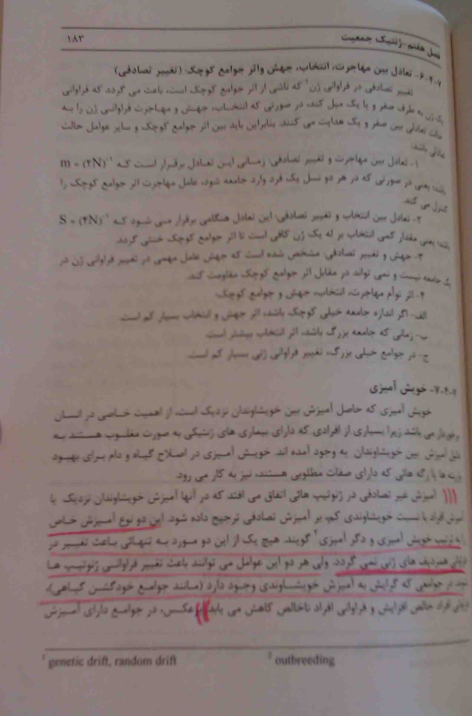 با سلام خدمت آقا رضای عزیز.بدون پرداختن به حاشیه که اگر بخوام وارد این موضوع(حاشیه) شوم جای صحبت زیاد داره. میرم سراغ اصل مطلب..... نوشته اید: تکلیف واژه (score) مشخص شود. خوب.. اگر شما به مباحث قبلی رجوع کنید.متوجه خوا هید شد.که بنده به تفضیل آنرا توضیح داده ام.. جای تعجب است که شما خودتان (registered) را مطرح وبعد فرافکنی کرده و بجای اینکه بنده از شما بپرسم که چرا(registered) به قول معروف : توپ را در زمین حریف میاندازید. به نظر میرسه بهترین کار ، آوردن صفحه اصلی کتاب و ملاحظه واژه انگلیسی آن میباشد.اگر برای شما مقدور باشه که صفحه اصلی (به زبان اصلی) کتابی که رفرنس داده اید را نشان بدهید.احتمالا" مشکل حل شود. و اما بعد......بنده در نهایت حسن نیت در مطلبی که به قول خودتان (ما همه جمع شدیم چیزی از هم یاد بگیریم) مرقوم کرده اید تا استفاده کنیم.چند اشکال دیدم.و با توجه به شعار شما که احترام به نظرات مخالف بود (.اگر دوباره سو برداشت نمیکنید).جسارتا" خواستم در حد وسع خود تذکر بدهم.ولی شما نپذیرفته و در جاهای کم لطفی کرده طفره رفتید......اگر کمی در مطالعه خود دقت بفرمایید.یادآوری خواهد شد.وقتی از تلقیح مصنوعی بحث میشه نباید آنرا به جفتگیری تصادفی ربط داد. وهمچنین ، مثلا" از توارث مندلی و ژنتیک کمی صحبت مکنیم.نباید یک مرتبه به ژنتیک جمعبت و تعادل(هاردی _ وینبرگ) رفت. نوشته اید: ( پاسخ به سوال شما بله هست البته با شرایطی که گفته شد ). اما جواب ((آمیزش غیر تصادفی در ژنوتیپ هائی اتفاق می افتد که در آنها آمیزش خویشاوندان نزدیک یا آمیزش افراد با نسبت خویشاوندی کم ، برآمیزش تصادفی ترجیح داده شود. این دو آمیزش خاص را به ترتیب خویش آمیزی ودگر آمیزی(genetic drift .random drift)گویند. هیچ یک از این دو مورد به تنهائی باعث تغییر [HIGHLIGHT=#ffff00]درفراوانی همردیف های ژنی نمیگردد.[/HIGHLIGHT] ولی هر دو این عوامل می توانند باعث تغییرفراوانی ژنوتیپ ها شوند.)) این یعنی جواب نه میباشد. رفرنس (مرجع) جواب بنده : اصول ژنتیک ، چاپ دوم ،انتشارات دانشگاه تهران ، کد: 2586 ،تالیف (نوشته نه ترجمه) دکتر :بهمن یزدی صمدی و دکتر بدر الدین ابراهیم سید طباطبائی.(البته در اینجا به ناچار باید نام مولفان برده میشد.) فصل هفتم . صفحه 183 .حالا با این مرجع و این نوشته باید از شما پرسید.:بنا به نوشته خودتان: ((پاسخ به سوال شما بله هست البته با شرایطی که گفته شد) بله، شما یعنی ،بحث" از دور خارج شدن ژن "[HIGHLIGHT=#ffff00]منتفی نیست.[/HIGHLIGHT] امابا توجه به رفرنس بنده بحث از "دور خارج شدن ژن "[HIGHLIGHT=#ffff00]منتفی است[/HIGHLIGHT].حالا باید کدام استدلال را پذیرفت.؟ با تشکر فراوان