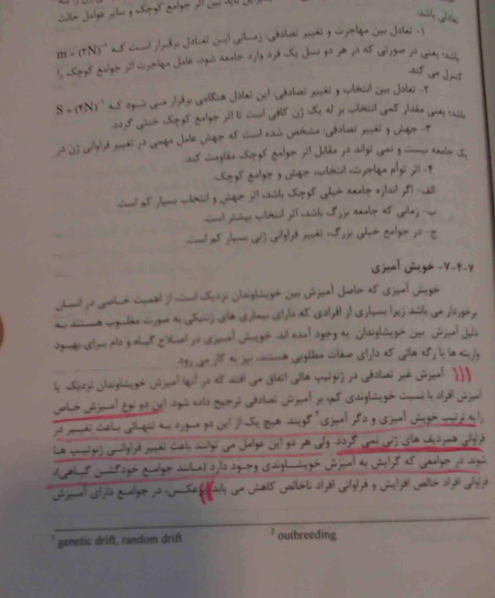با سلام خدمت آقای رضای عزیز. سوال بنده از شما این بود که آیا آمیزش غیر تصادفی باعث تغییر در فراوانی" همردیف های"ژنی میگردد؟ پاسخ : نه خیر میباشد. نه خویش آمیزی و نه دگر آمیزی ، هیچ یک باعث تغییر در فراوانی" همردیف ها "، نمیگردند. ولی هر دو میتوانند باعث تغییر فراوانی ژنوتیپ ها شوند. هدف بنده نه تست ، نه امتحان شما نه چیز دیگر بود. بلکه خواستم بوسیله این سوال متذکر شوم که بحث "از دور خارج شدن ژن" منتفی است. ولی شما بجای پاسخ فوق از تعادل نوشته اید. که احتمالا چون در تعریف تعادل (هاردی -- وینبرگ) فراوانی ژنی نیز آمده و شما در جستجو ی پاسخ در کتابهای موجود البته بنا به گفته خودتان ( رساندن اطلاعات از کتبهای موجود بدون هیچ گونه کم و کاستی ) به آن رسیده و مرقوم نموده اید. که فکر کنم نتیجه ، پاسخ مناسبی نشده است. اگر شرایط قانون (هاردی -- وینبرگ) ملاحظه شود. یکی از شرایط آن ، این است که : آمیزش افراد جامعه باید بطور کاملا" تصادفی باشد. مگر اینکه شما تلقیح مصنوعی را آمیزش تصادفی در نظر گرفته باشید!! . با تشکر فراوان