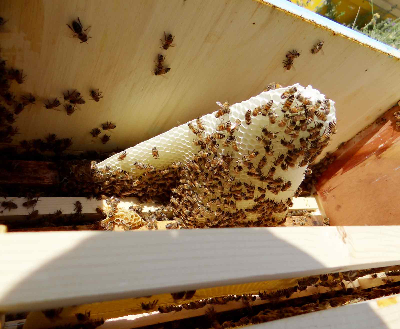اگه تو شکل اشتباه ندیده باشم هرزه بافی رو سلول نر زدن . این نشون میده تو فصل بهار و اوج تخمریزی ملکه هست و زنبورها طبق غریزه میخان نر تولید کنن . بنابراین برگه موم رو نمیبافن یا اون رو پاره میکنن .