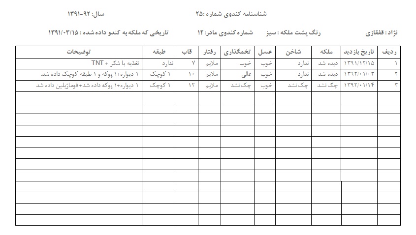 شناسنامه کندو باید در جدولی که شامل مطالب:سال تولد ملکه،تاریخ بازدید و مشاهده ملکه در هر بازدید،میزان تغذیه موجود در کندو در هر بازدید،وضعیت تخم گذاری،تعداد قاب زنبور،آمادگی برای بچ دادن و مطالبی که به نظر خودتون مهم بنظر میرسن باشه