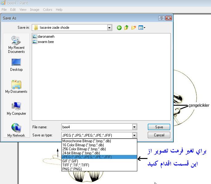 براي تغير فرمت تصاويرتون تصويرتون رو با كمك پائينت باز كنيد گزينه fail و بعد گزينه save az رو بزنيد بقيه مراحل در تصوير مشخصه