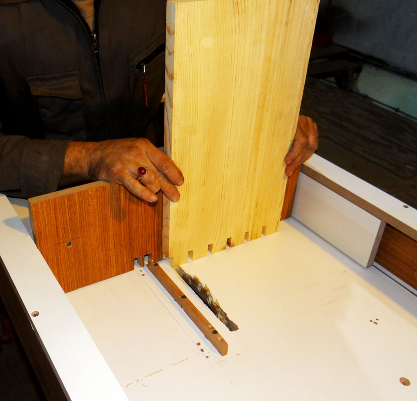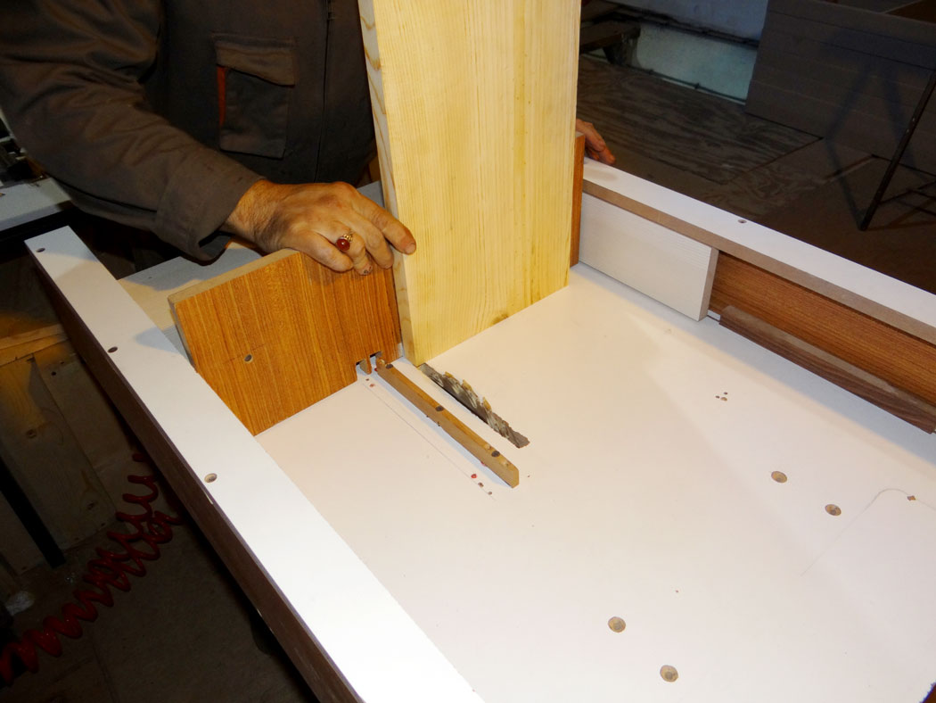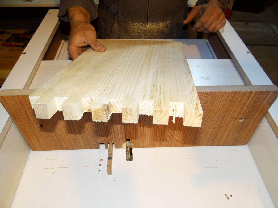 ولی فکر کردم میشه 10 قطعه چوب را که از نظر فاق و زبانه به هم شبیه هستند رو با یک پیش دستی بست و یک مجموعه از قطعات چوب رو بر روی تیغه حرکت داد و عمل شیار زدن برای درآمدن فاق را انجام داد که با 72 حرکت یک دسته 10 تایی رو میشه فاق و زبانه کرد.
