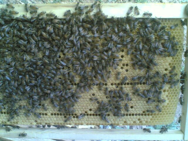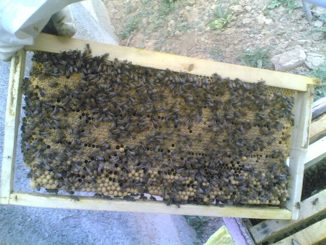 این هم عکسهای تخمریزی ملکه در 8قاب طبقه بالا در ضمن 8 قاب را با 8 قاب از طبقه پایین جابجا کردم ببینم چی میشه در ضمن سلولهای کناری شانها که خالی هستنددر داخلشان تخم روز ولارو است.چند عدد پستانک هم در عکسها دیده میشود که نمیدانم باید خراب کنم یانه داخل پستانکها خالی است.درضمن طبقه دوم را 20 فروردین به کندو دادم آنهم با 10 برگه چون شان آماده نداشتم که همگی را بافته اند وملکه هم داخل همگی آنها تخمریزی کرده است.از 8قاب طبقه پایین 4تا پراز عسل دربسته بود که