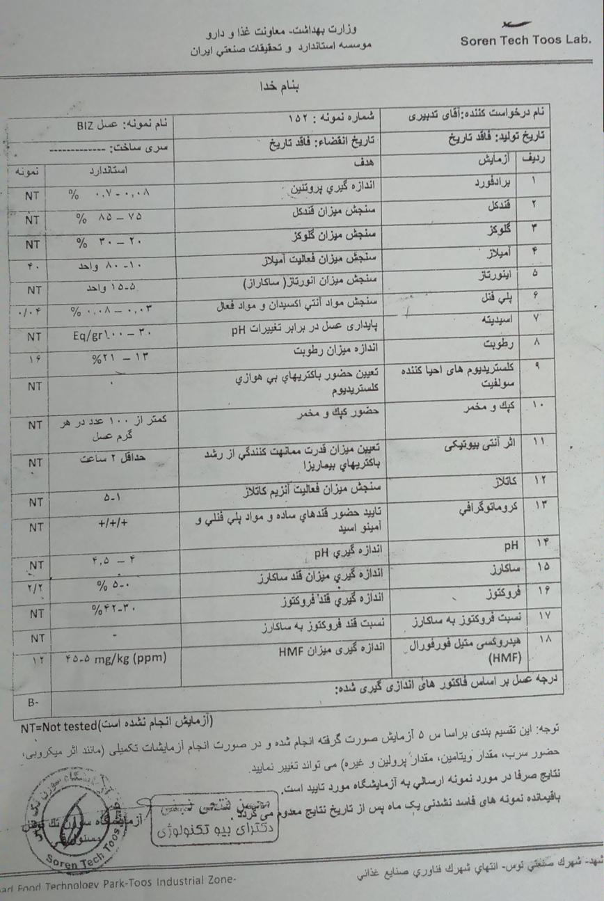 یک نمونه آزمایش عسل برای عسلی به بنده داده شده می خوام راهنمایی کنید این عسل دارای چه معایب و مزایایی است و آیا آزمایشگاه بجز مواردی که در زیر برگه اعلام کرده نتیجه جامعی اراپه کرده و کلا کیفیت این عسل چقدره و در بازار الان چقدر می ارزه؟ بیشابیش از راهنمایی عزیزان ممنونم