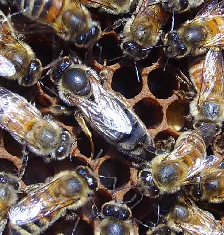احتمالا شماره های 3و4 باتوجه به اینکه روی سینه ملکه به مقدار زیادی کرک وجود دارد و از طرفی زنبورهای کارگر کمی در اطرافشان هستند از همه جوانتر هستند (ملکه تازه جفت خورده ) ملکه های عکسهای 2و5 کمی مسن تر از 2عکس قبلی زیرا بدنشان کرک داشته و اطرافشان را زنبورهای کارگر احاطه کرده اند(ملکه 1یا 2ساله ) و2عکس 1و6 ملکه پیر میباشندبا اینکه توسط زنبورهای کارگر احاطه شده (عکس6) ولی بدنشان کرک زیادی ندارد(ملکه 2سال به یالا).