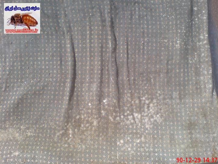اين هم تصويري از كپك زدن پارچه روي شانها و در كندو.اگه دقت كنين يك قسمت خاصي از پارچه كپك زده.اين همون قسمتي هستش كه زنبورا در اون قسمت نبودن وطرف ديگه زنبور وجود داشته