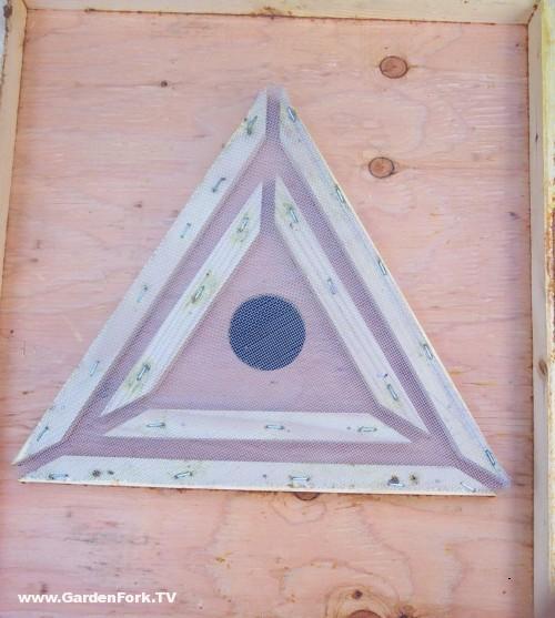 در اینجا دو سه راه فرار زنبور عسل ساخته شده است. من بر اساس آن را در چند بر روی اینترنت.سخت ترین بخش این است که برش کاهش زاویه از هر قطعه ای از چوب است. برش یا 30 درجه یا 60 درجه، بسته به چگونه به شما در راه اندازی دیدم. شکاف بین دو طرف مثلث حداقل 3/8 "گسترده ای هستند. من با استفاده از پنجره روی صفحه نمایش به طور منظم برای پوشش این. قطعات بیرونی از چوب 12.5 "طولانی، قطعات داخلی هستند 7.75" بلند است.
