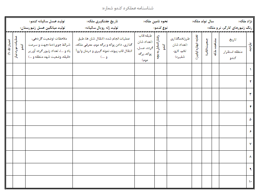 من امسال برای خودم با توجه به نیاز ها خودم یه شناسنامه کندو تهیه کردم که درش سعی کردم چیزهایی که اهمیت داره رو لحاظ کنم و برای هر کندو یه نمونه داشته باشم و در بازدید هام اونها رو لحاظ کنم